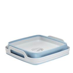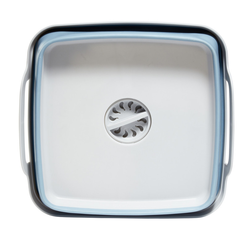 Cette bassine rétractable grise et bleue avec bouchon évideur sera idéale pour nettoyer vos fruits et légumes.