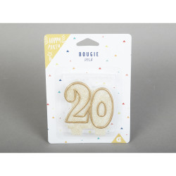 Bougie d'anniversaire spéciale 20 ans au coloris doré pailleté.
